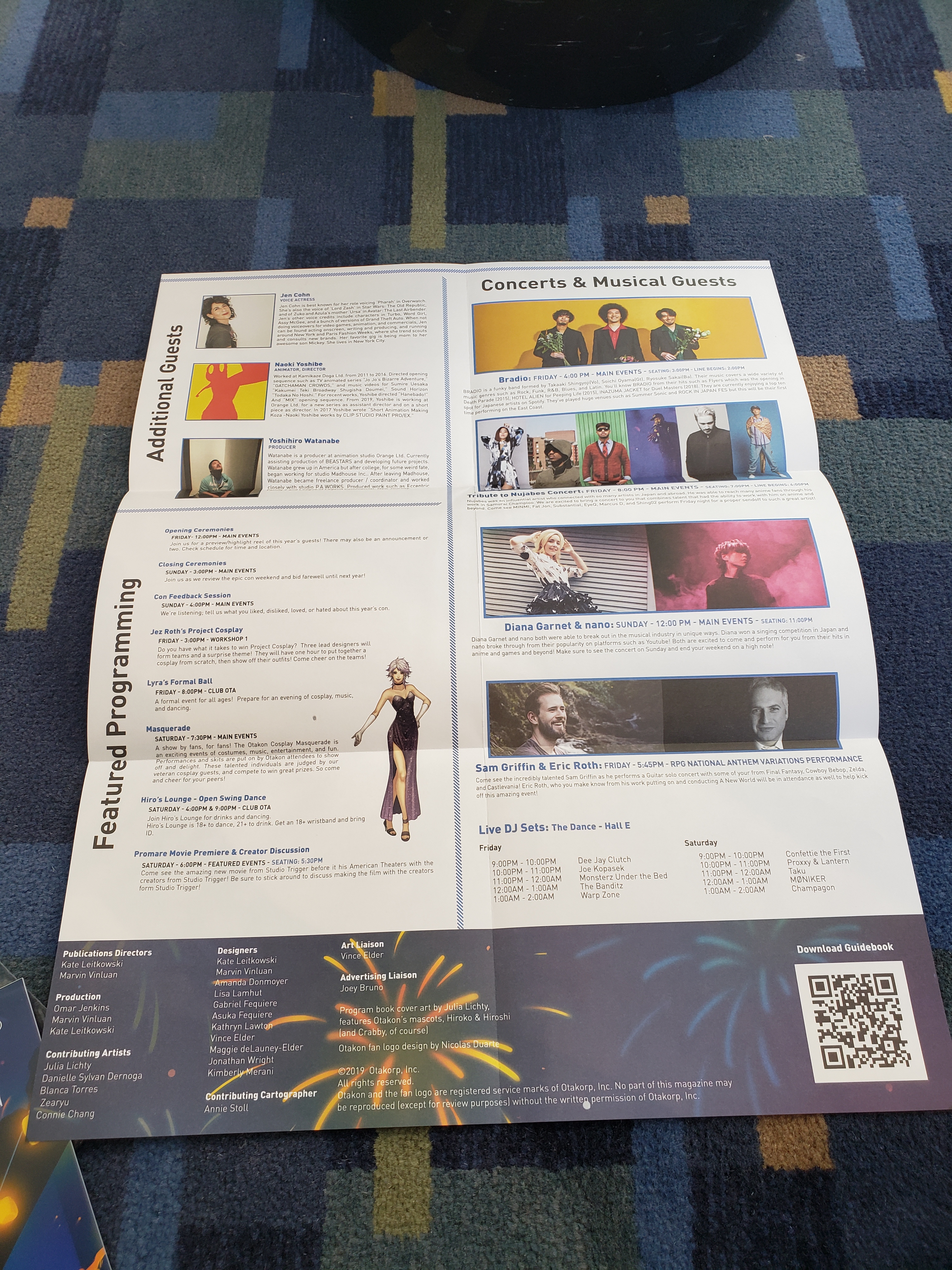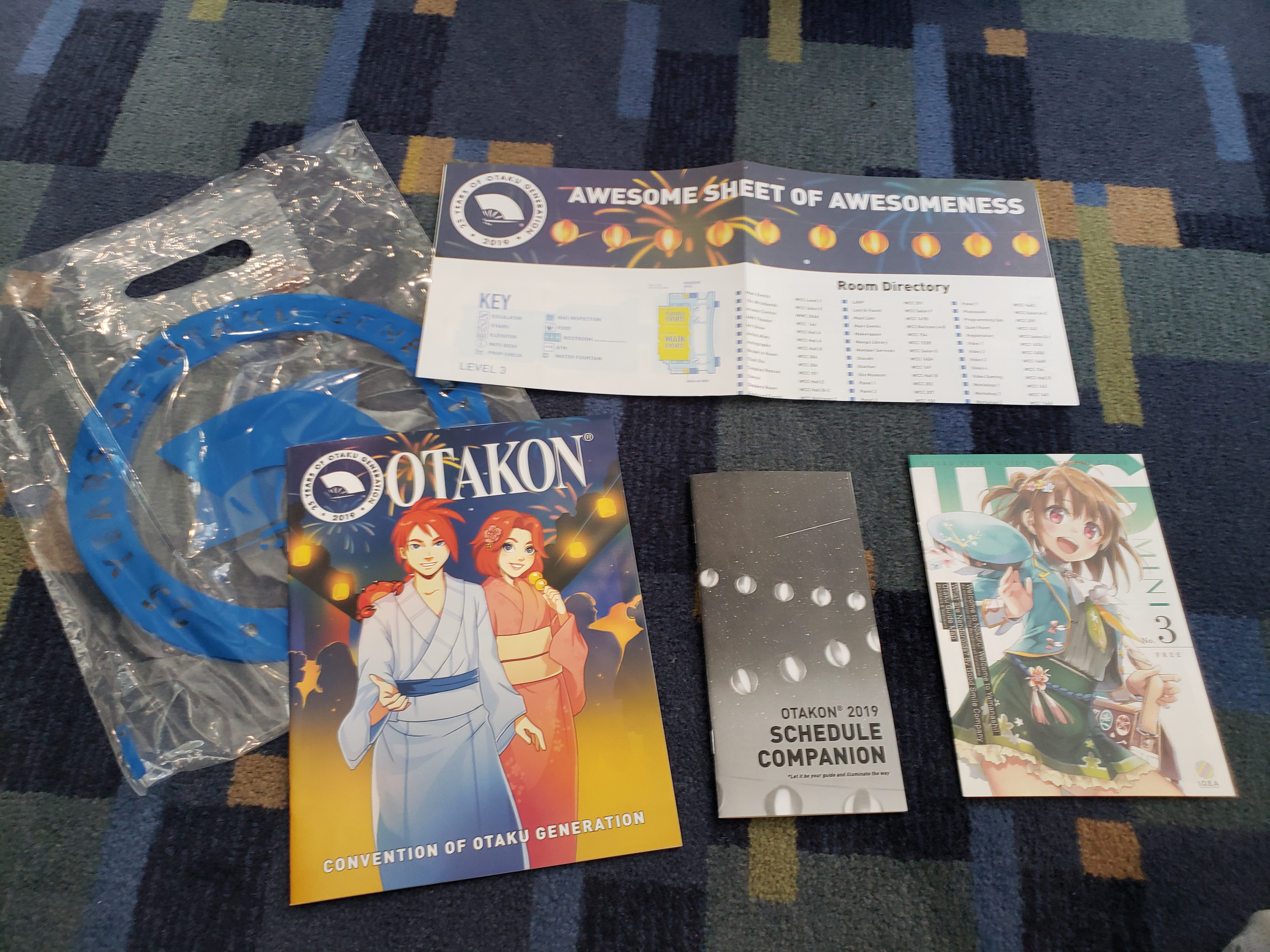 I was handed a bag upon check-in. It had my Friday badge with an orange Crunchyroll lanyard, Schedule Companion, Otaku Study Guide, Program Guide, and an Awesome Sheet of Awesomeness (directory and program highlights).