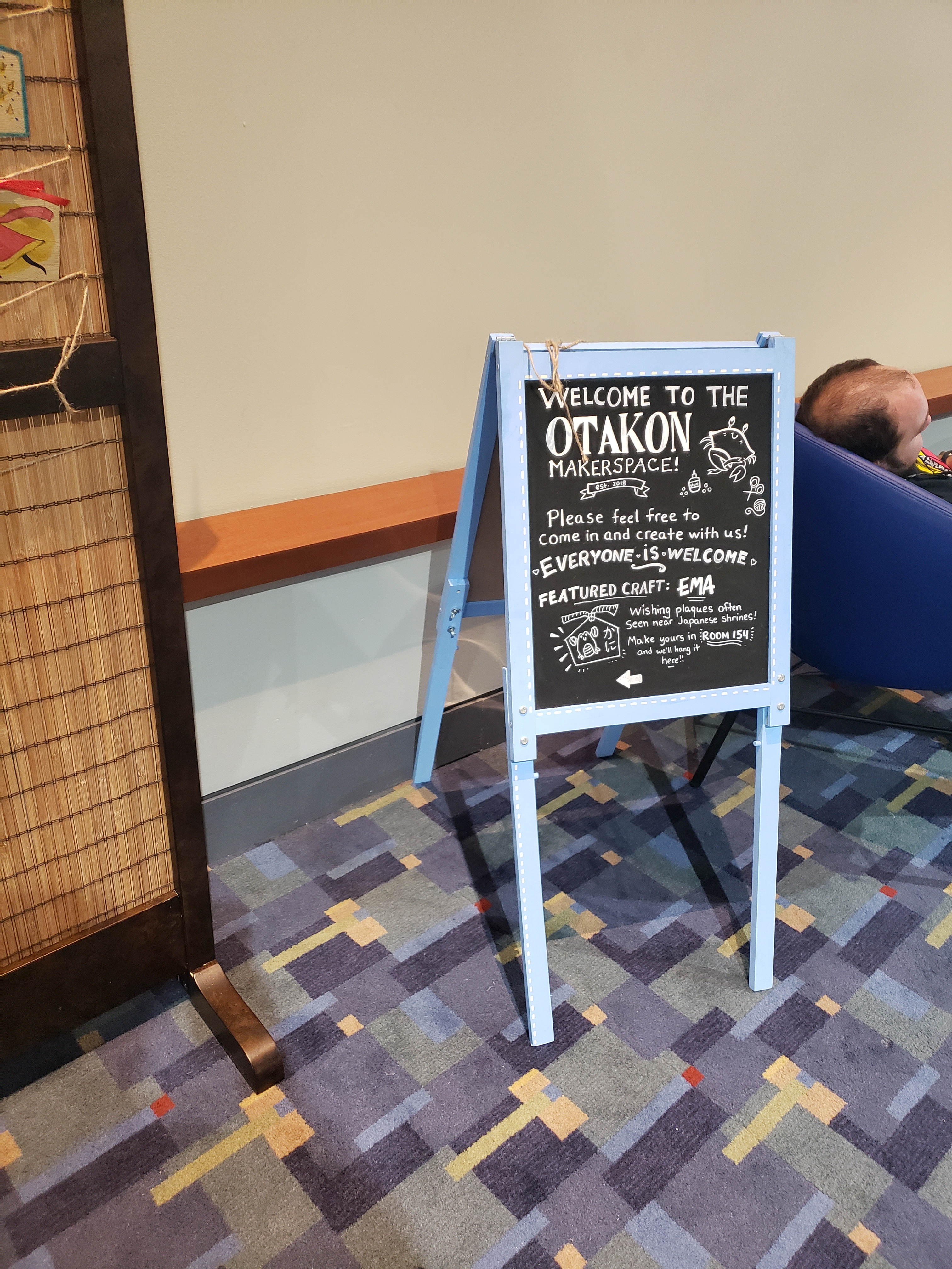 Not being particularly creative, I didn’t think this room would appeal to me. But now that I stood right in front of it, I could feel peace and calm radiating from this room, and everyone looked so happy. I had to go in. There were folks sitting at round tables working on various projects. You could sit wherever, and people were happy to say hi and chat. The staff was friendly and were there to assist if we needed help conceptualizing our ideas. They even had a wheel if you were stuck for ideas. Tons of materials were available for us to use for our projects; scissors, hot glue guns, cardboard, markers, crayons, ribbons, paint, felt, and so much more! It was extremely well organized. And there was a wide variety of origami paper if you felt inclined. I really enjoyed myself and I felt rejuvenated when I left. I decided to make an EMA. (No I don’t think it’s a coincidence EMA is also the abbreviation for the blog Empath Meets Anime lol).