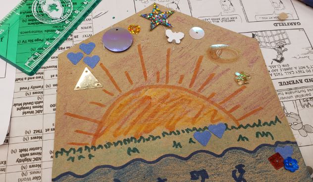 Not being particularly creative, I didn’t think this room would appeal to me. But now that I stood right in front of it, I could feel peace and calm radiating from this room, and everyone looked so happy. I had to go in. There were folks sitting at round tables working on various projects. You could sit wherever, and people were happy to say hi and chat. The staff was friendly and were there to assist if we needed help conceptualizing our ideas. They even had a wheel if you were stuck for ideas. Tons of materials were available for us to use for our projects; scissors, hot glue guns, cardboard, markers, crayons, ribbons, paint, felt, and so much more! It was extremely well organized. And there was a wide variety of origami paper if you felt inclined. I really enjoyed myself and I felt rejuvenated when I left. I decided to make an EMA. (No I don’t think it’s a coincidence EMA is also the abbreviation for the blog Empath Meets Anime lol).