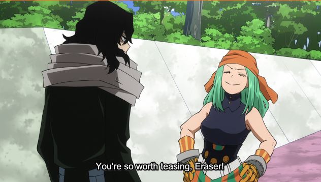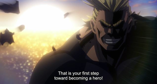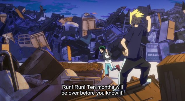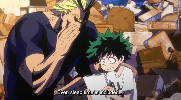 What a great mentor! All Might is training with Deku to get him ready for his upcoming entrance exam for U.A. High School, a school that trains and prepares students to become heroes. Not only is All Might his mentor, but Deku has looked up to him for years, and holds him in the highest regard. No pressure!