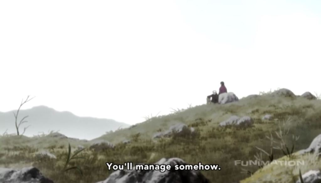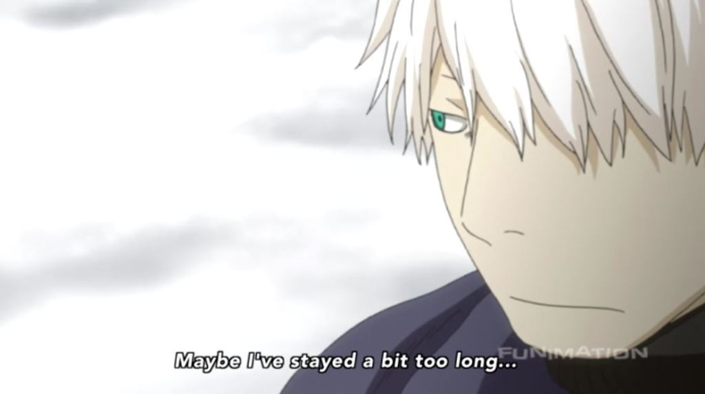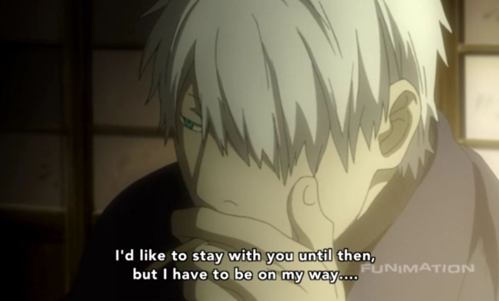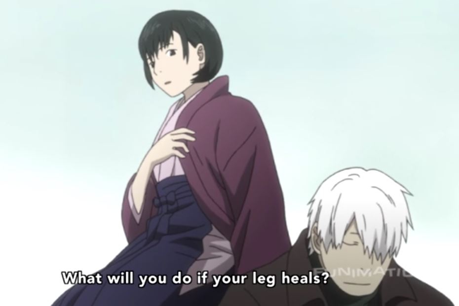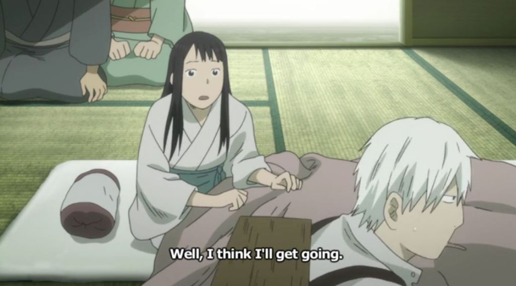 At first I was annoyed Ginko wouldn’t say goodbye to Suzu, she saved his life! Granted he risked his to save her brother’s. But still, he could see her to say farewell. And Ginko’s avoiding eye contact in this scene, like he did earlier when he told Suzu he was sorry that he couldn’t stay.
