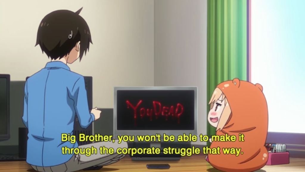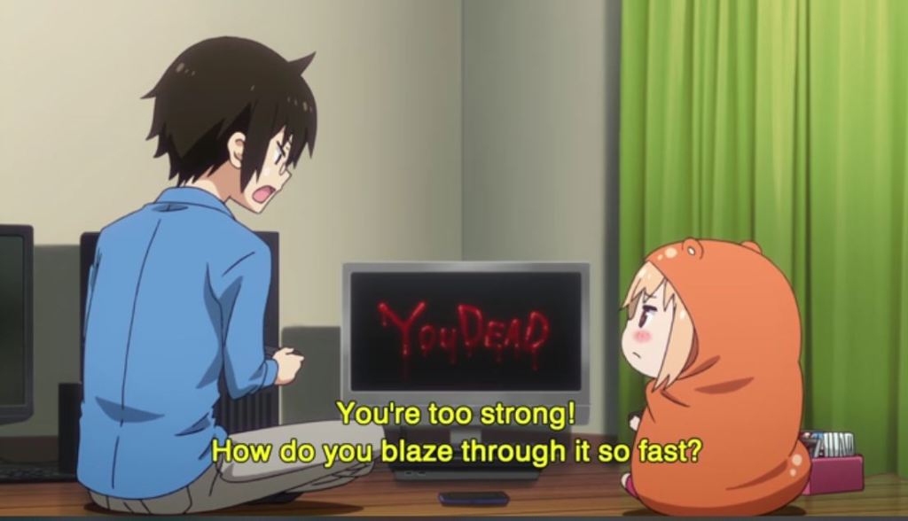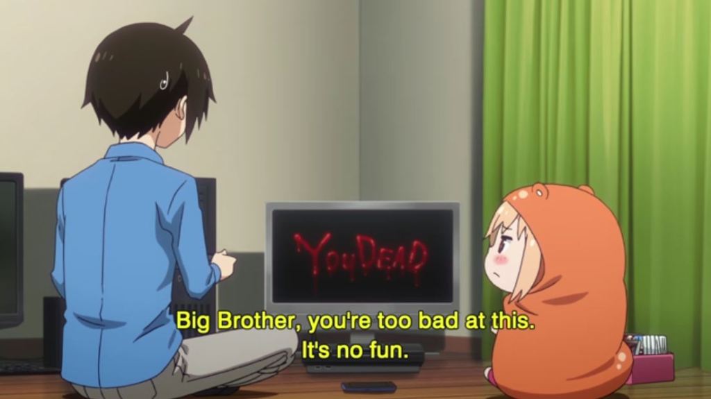 Umaru is top of her class, excels in piano, sports, and is doing great at school. So it’s difficult to scold her when she’s laying around at home. In her free time she’s playing video games (if not watching anime, reading manga, scrolling online, snacking, or napping). While her brother has little, to no free time, and is not great at video games.
