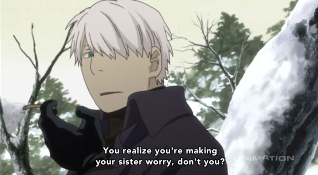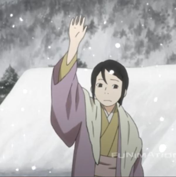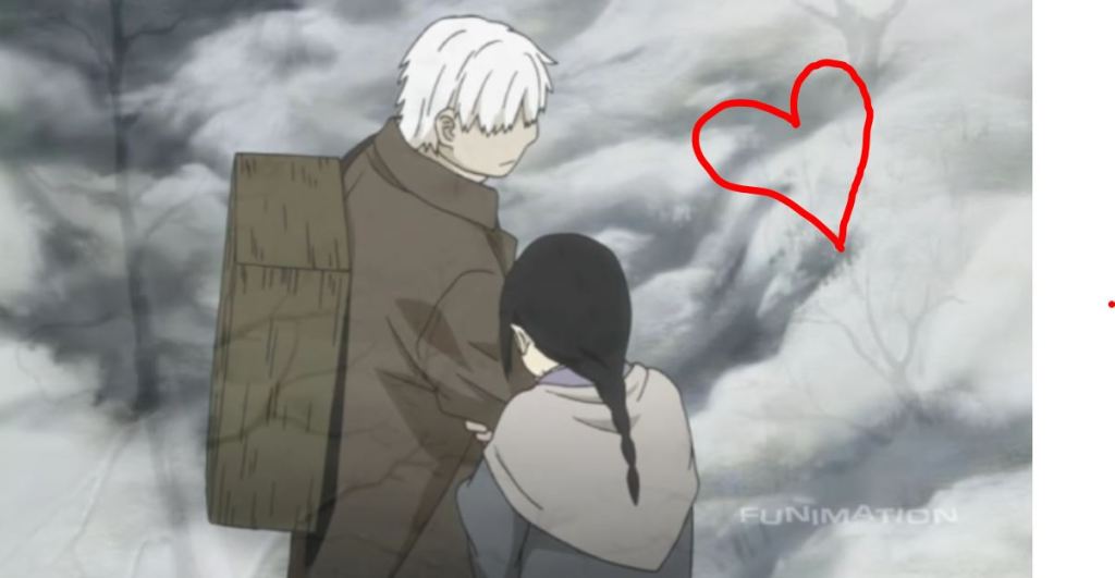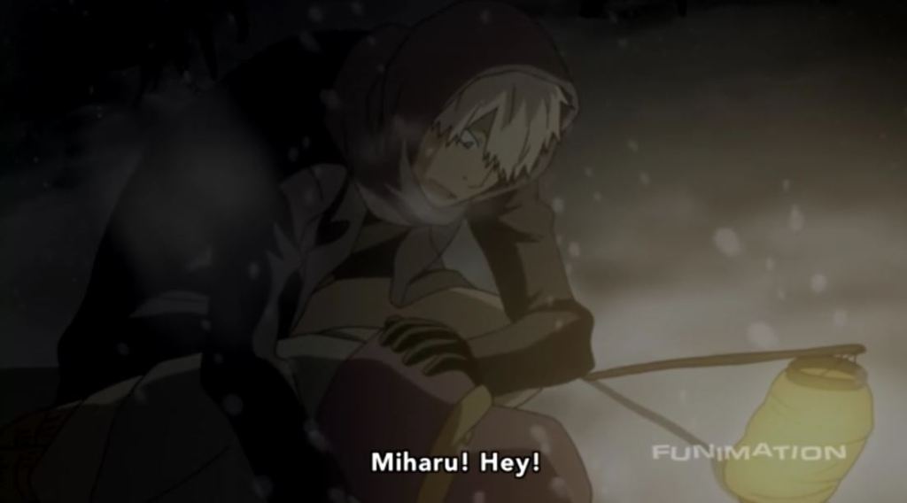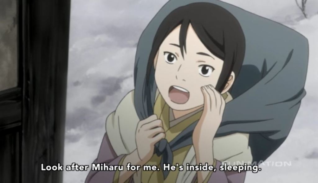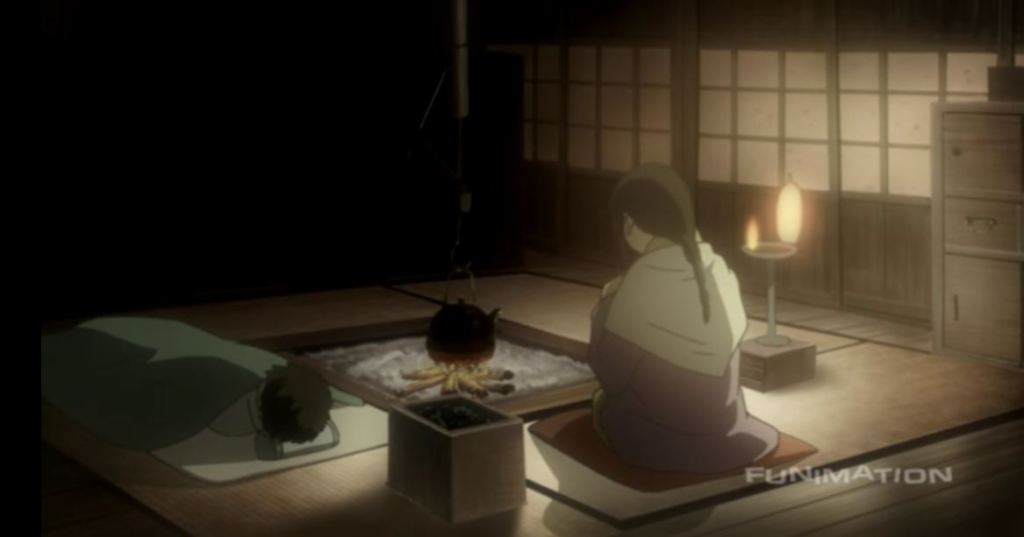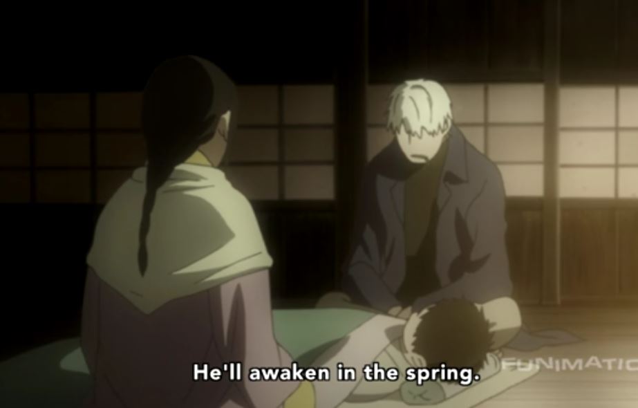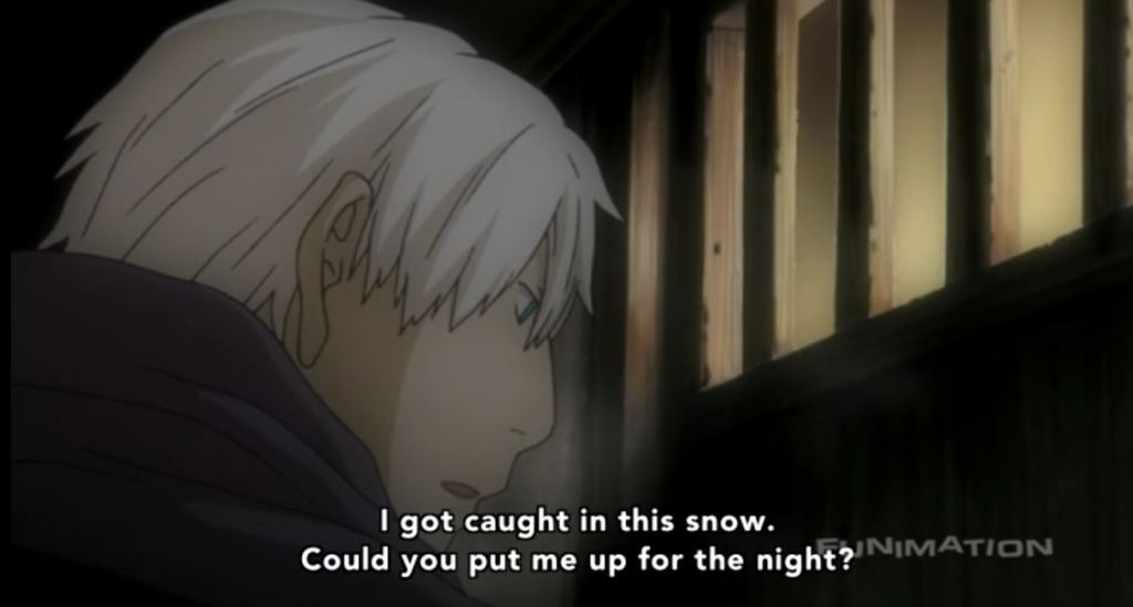 Season One, Episode 15 of Mushishi (watching on Hulu), Ginko is seeking shelter from the harsh winter weather. He stumbles upon Suzu’s home, that she shares with her little brother Miharu.