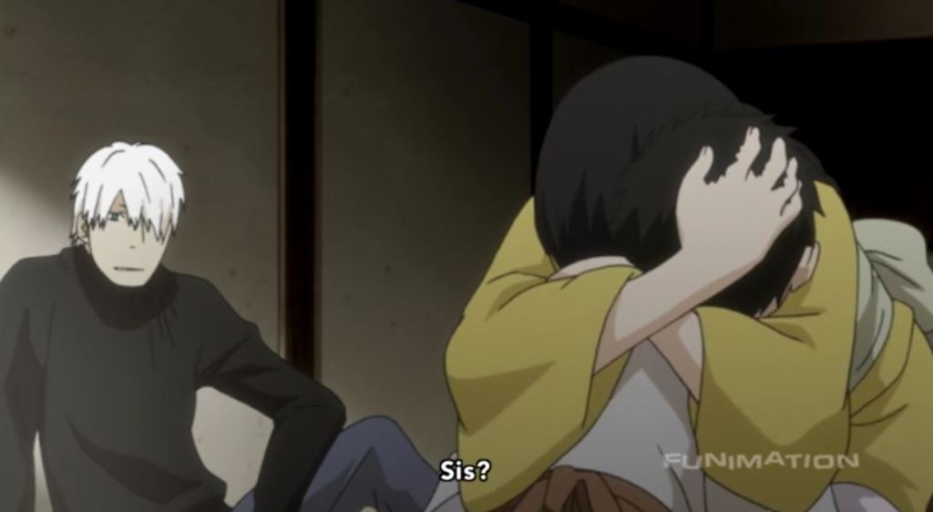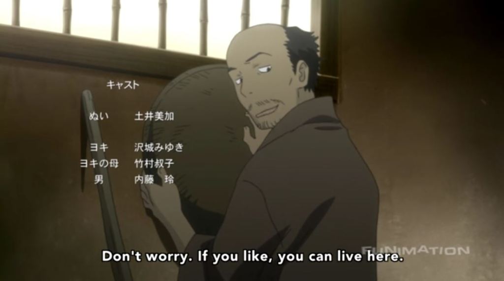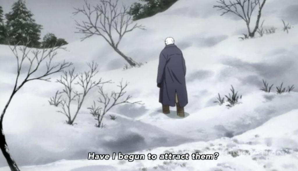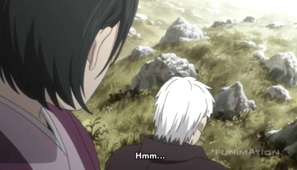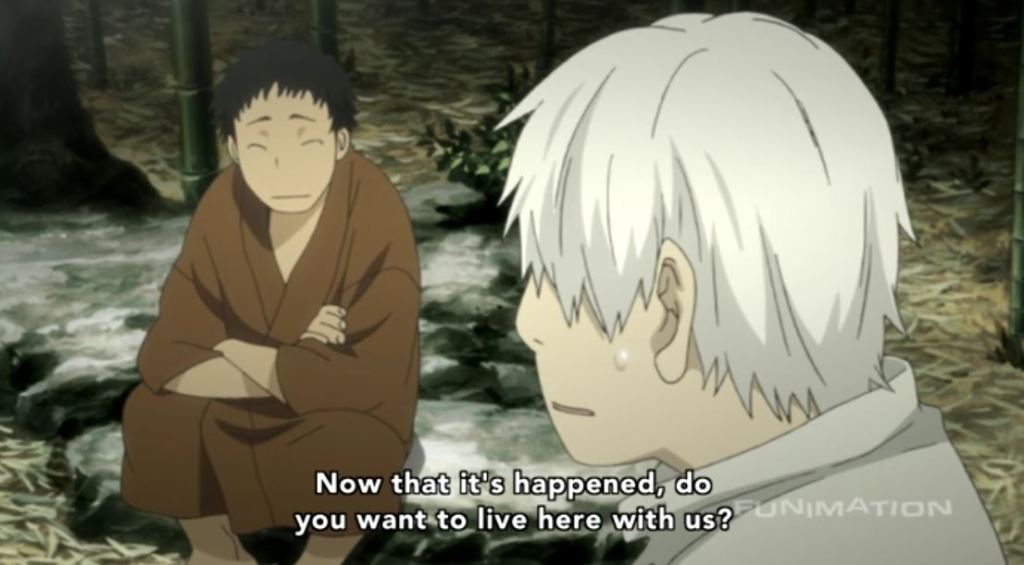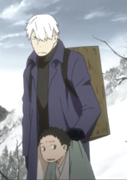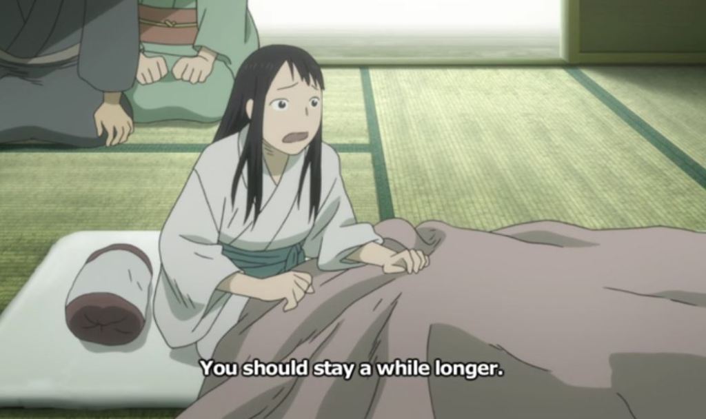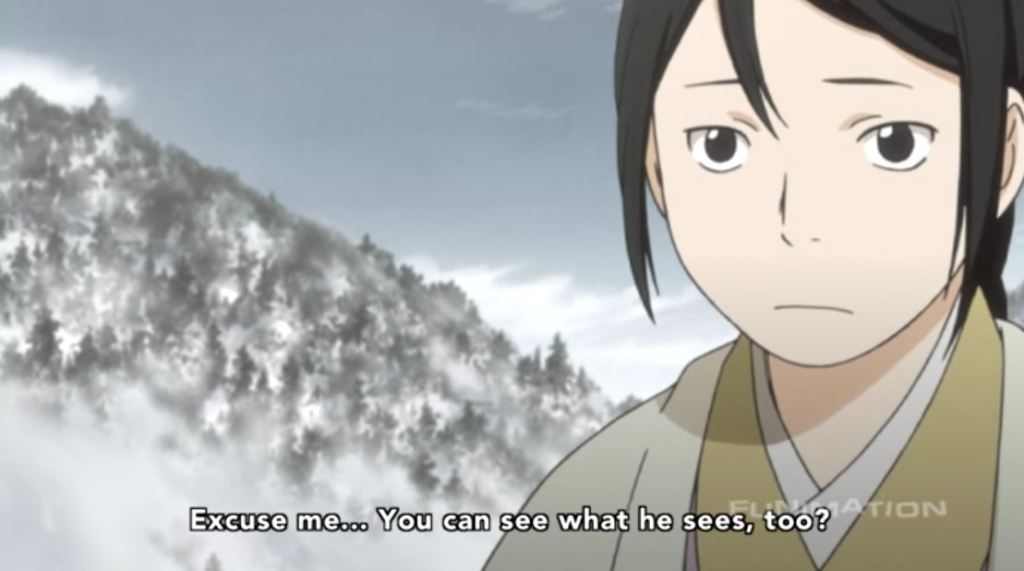 Season One, Episode 15 of Mushishi (watching on Hulu), Ginko is seeking shelter from the harsh winter weather. He stumbles upon Suzu’s home, that she shares with her little brother Miharu.