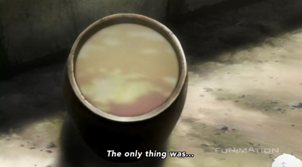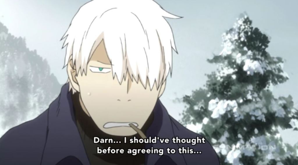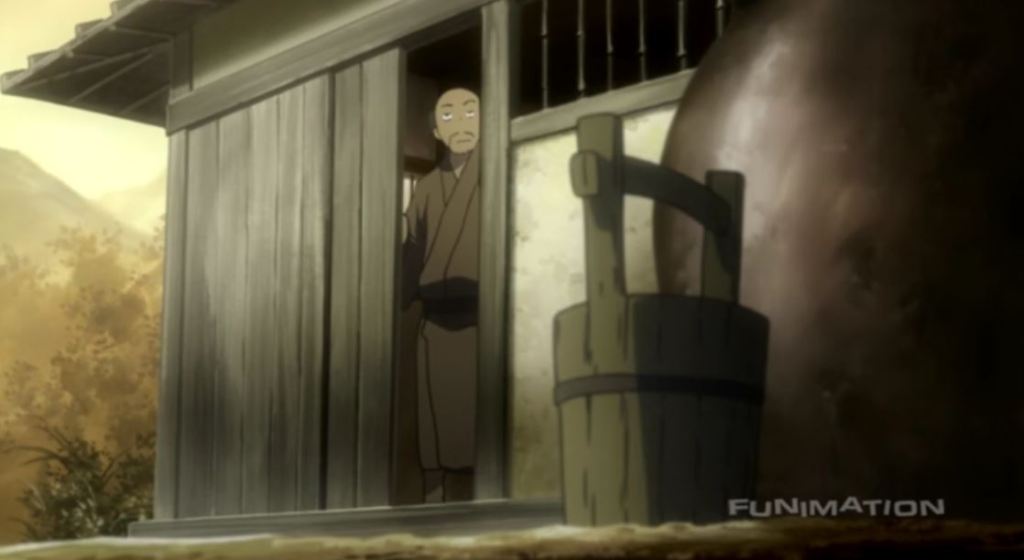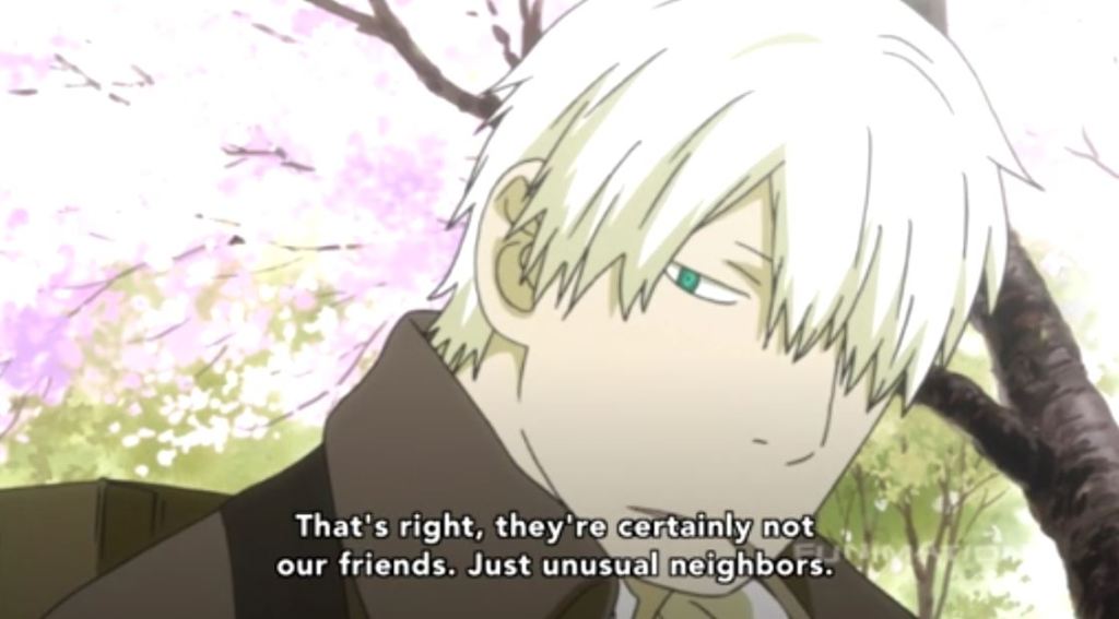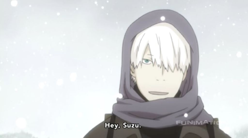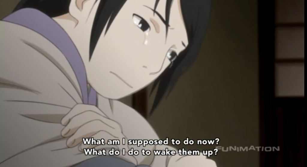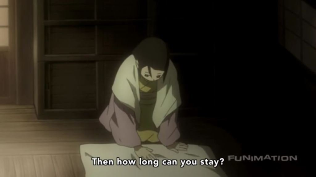 Season One, Episode 15 of Mushishi (watching on Hulu), Ginko is seeking shelter from the harsh winter weather. He stumbles upon Suzu’s home, that she shares with her little brother Miharu.