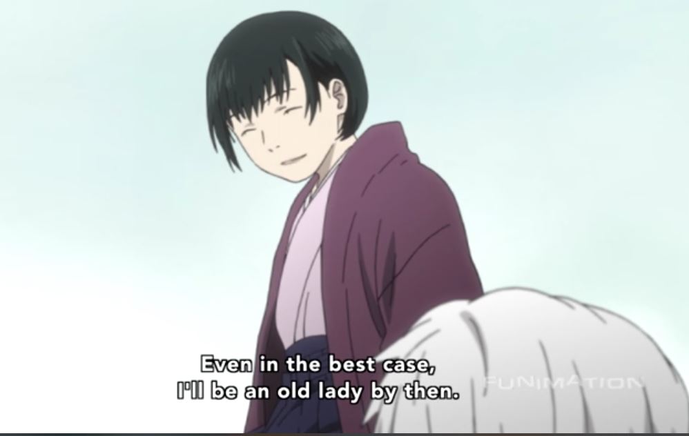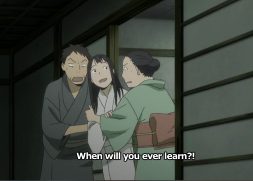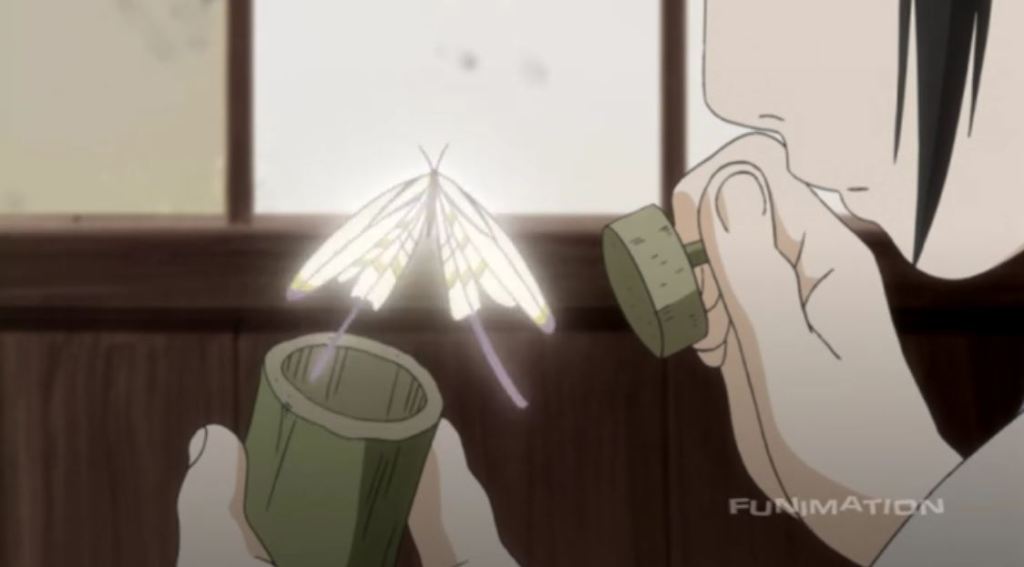 The butterflies that are involved with this episode, made me think of that saying about how one shouldn’t chase butterflies. I don’t know if the idea of chasing butterflies conveys that it’s not practical, or unrealistic. Perhaps that is a metaphor for the idea of Ginko living in a home with a family and being happy, in that sense, is impractical.