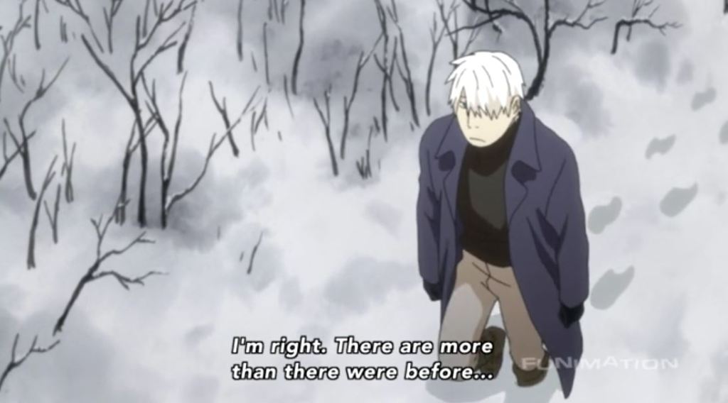 With the type of soil near Suzu and the cold weather, Ginko was hoping he’d be alright staying in one place for a little while, but realizes the number of mushi in the area has already increased.