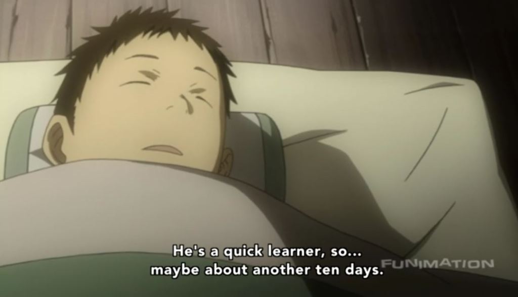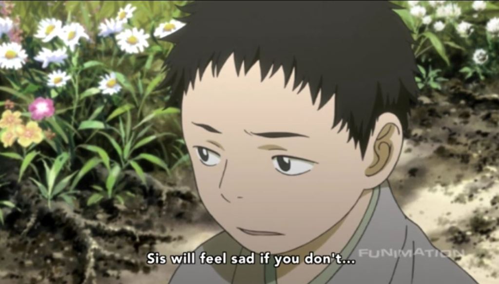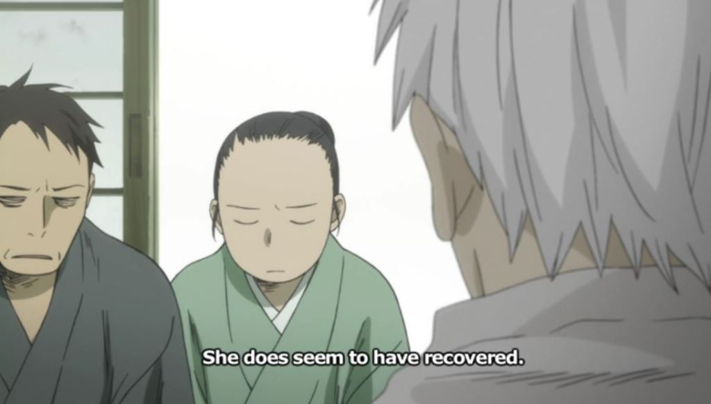 Her brother’s slumber lasted longer than usual and she is understandably alarmed. Caring for her little brother as the sole guardian can be stressful, especially when he is chasing after mushi, but worrying that he’ll never wake up is even more stressful.