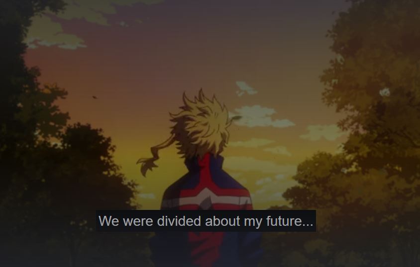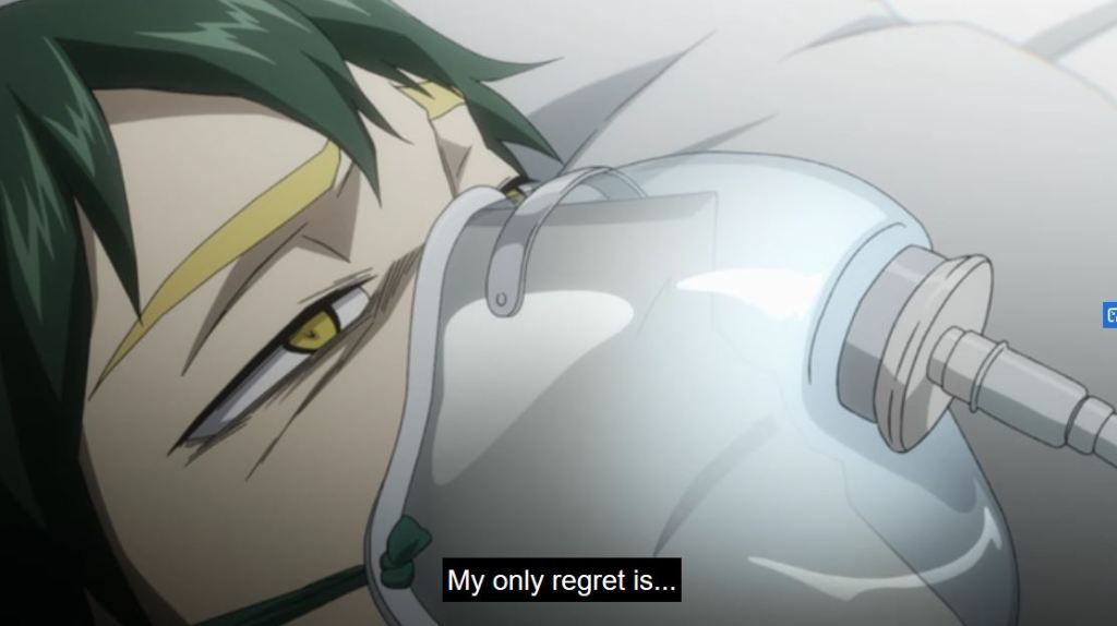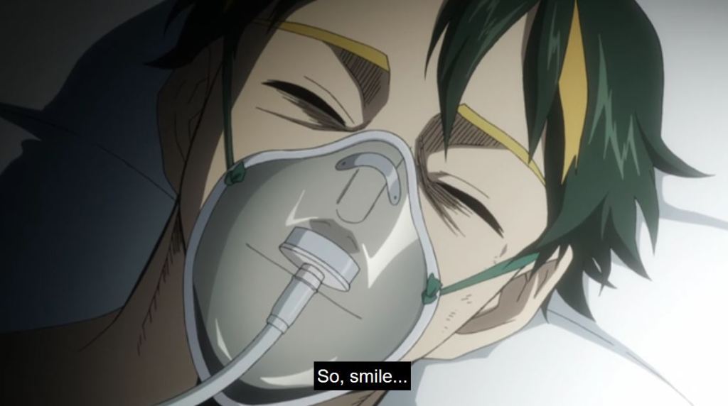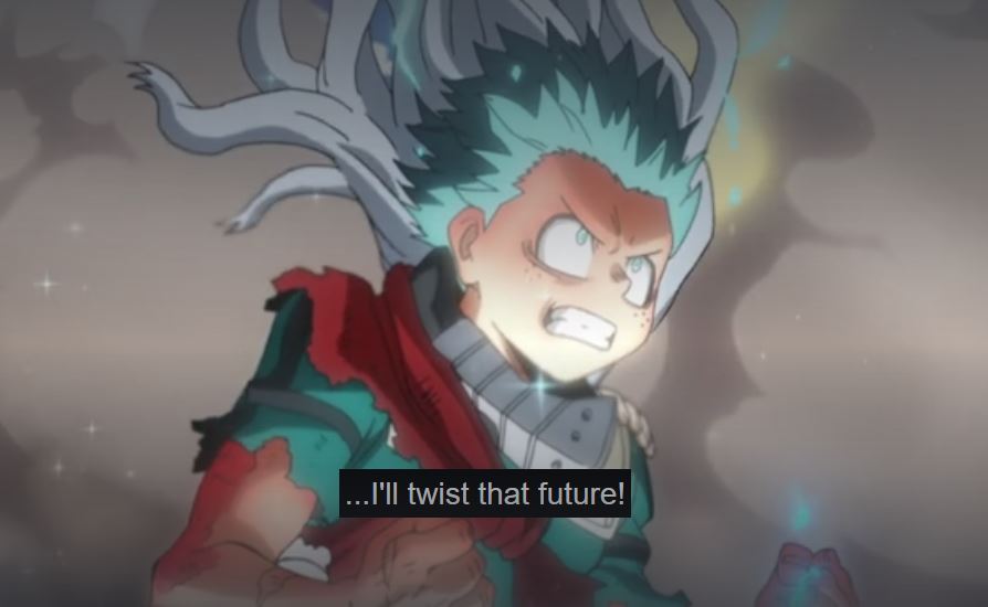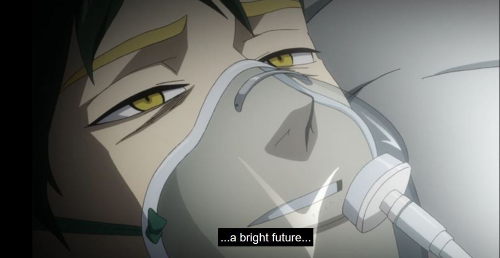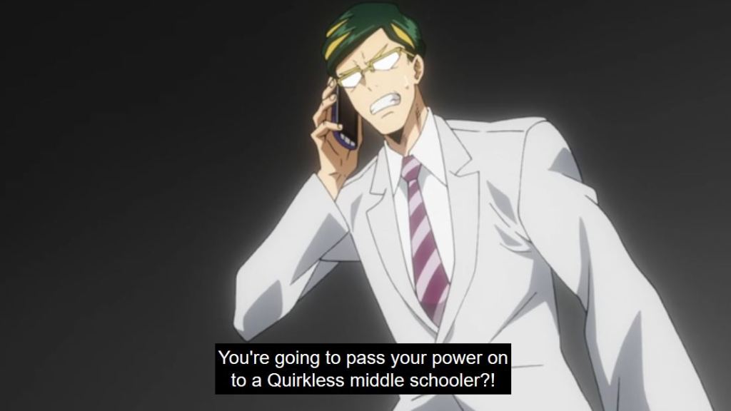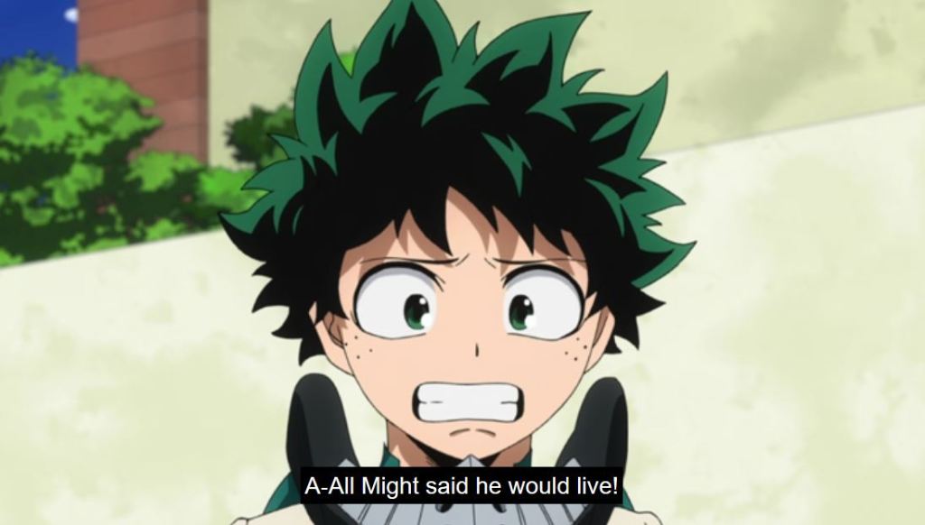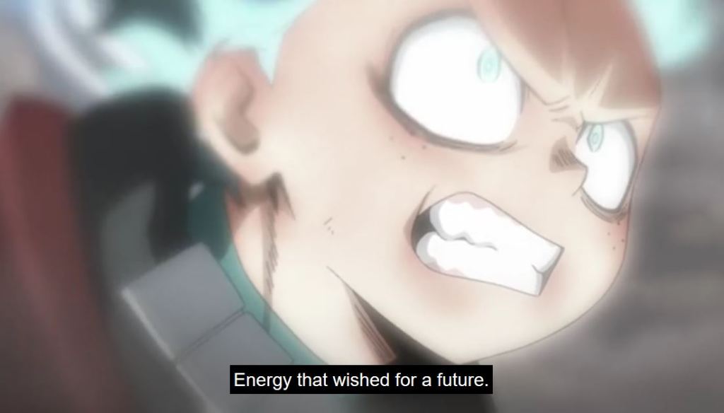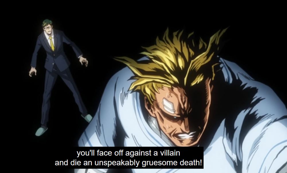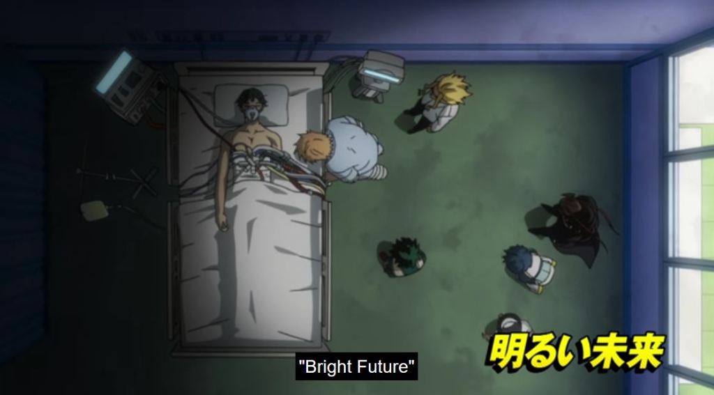 In the episode, Infinite 100%, we see Sir dejected. He is mortally wounded and the future he sees, shows Deku dying. He doesn’t see a point to the pro heroes and students, especially injured, risking more to fight. As the crew on the podcast Popped Off (@popped_off) pointed out this seems unusual for a hero. But given that Sir’s Foreight has never been wrong, there isn’t a precedent for him to think it can change, so his outlook is understandable. Thankfully, the future is different than he envisioned. Overhaul is defeated and Eri is saved. Sir Nighteye received his wish, through Deku, and the energy and efforts of those helping. But now, in the episode Bright Future, Sir Nighteye (not All Might), has been mortally wounded due to a villain.