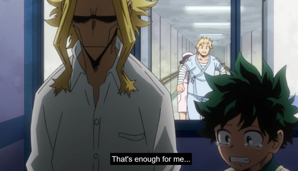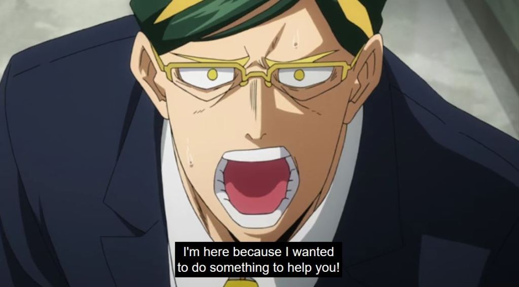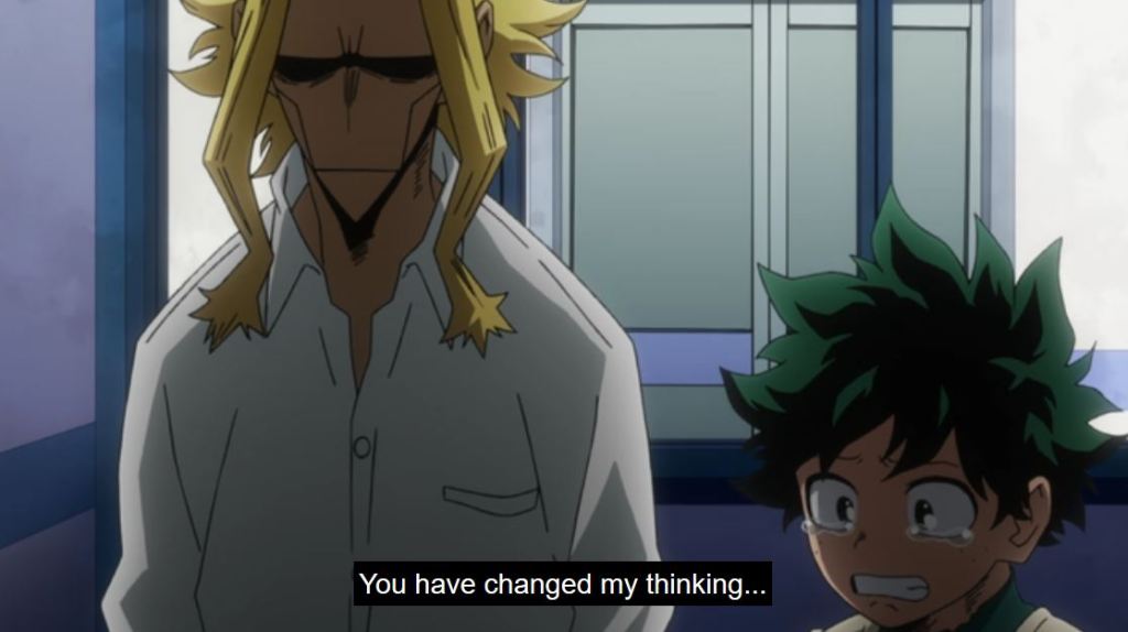 This episode really illustrates the meaningful relationships between mentors and those they inspire. Some of the relationships that came to mind as I considered this were All Might inspiring Sir Nighteye, Deku, Bakugo, and countless others, Mirio mentoring Deku at work studies, Aizawa inspiring his students, Sir Nighteye as a mentor to Mirio, Bubble Girl, and Deku, and Nana Shimura and Gran Torino helping train Toshinori Yagi (All Might). There are countless people in the world inspired by the actions, personality, quirks, skills, traits, and outlook of others, not just in the world of My Hero Academia and anime land, but all around us. You likely inspire people by being your true, authentic self, in your daily life, even doing what you consider mundane things.