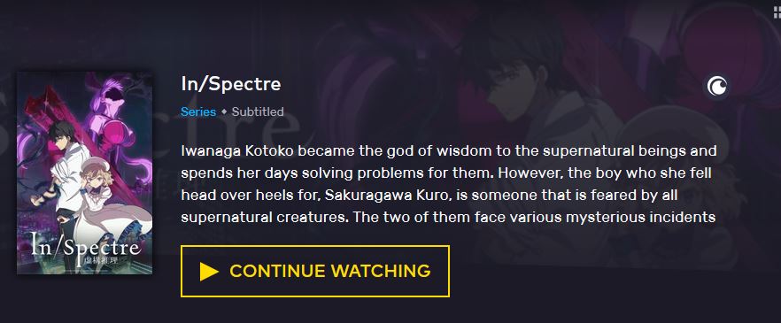 I’m currently watching In/Spectre on VRV, on Crunchyroll. Their brief blurb is here: