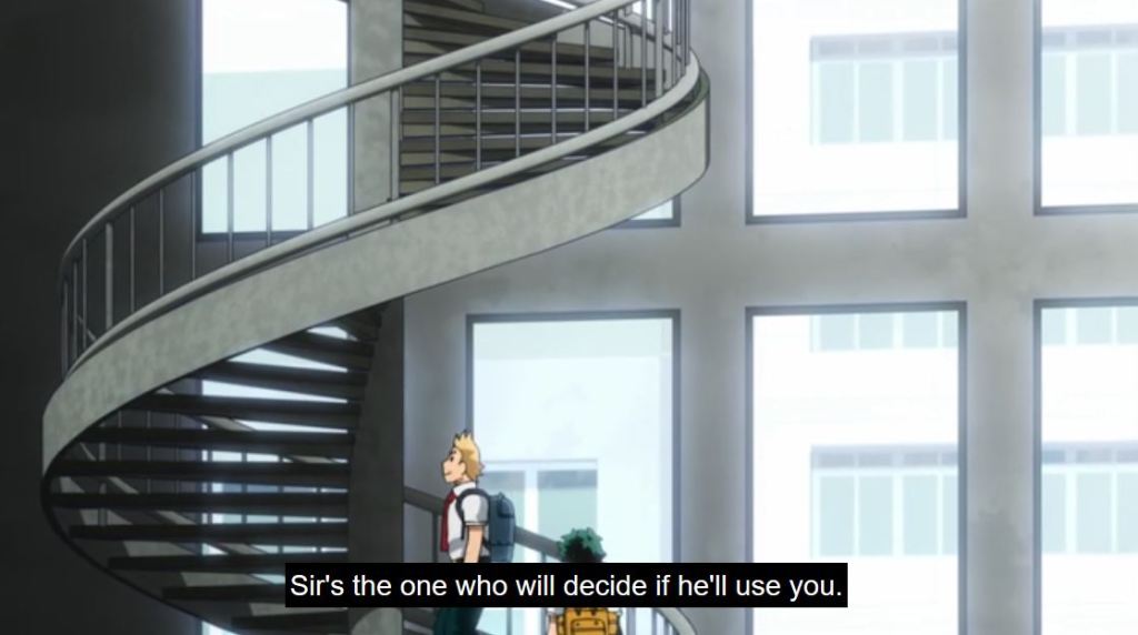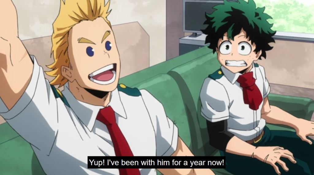 Not knowing the history behind them, Deku wanted to work with Sir Nighteye. All Might doesn’t feel comfortable introducing them, plus he was against first year students doing work studies. But he does introduce him to Mirio who is currently working with Sir. All Might reflects upon the idea, presented a while back by the UA Principal and Sir, for him to pass his quirk, One for All, to Mirio (before he ran into Deku trying to save Bakugo from Sludge).