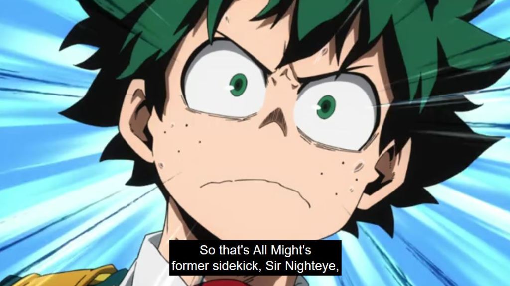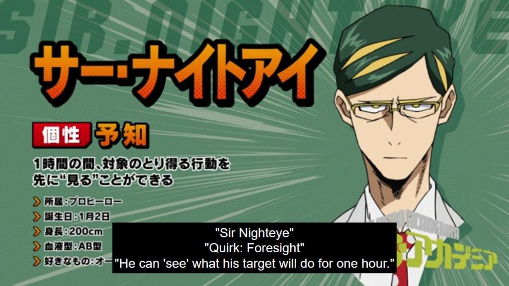 Pro Hero, Sir Nighteye, was All Might’s sidekick for a number of years. He looked up to All Might as a mentor, but also cared for him as a friend. Sir took being a hero seriously, but also appreciated humor. He was overly cautious, likely due to his quirk Foresight. He’d send chills down people’s spines due to his stern piercing gaze. Thanks to an introduction by Mirio (that All Might helped facilitate), he took Deku for the work studies program. Sir really agreed to it because he wanted to show Deku that Mirio was the better candidate to be All Might’s successor. While on patrol with Mirio, Deku runs into Eri and Chisaki. Deku wanted to save Eri, because she’s clearly frightened and does not want to go with Chisaki (Overhaul). For wanting to save her Nighteye chided him (although later they all wondered if it would’ve been better to save her then). Sir did not think Deku was useless, but he definitely gave him a hard time.