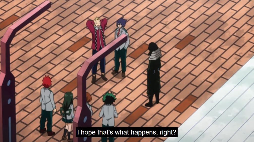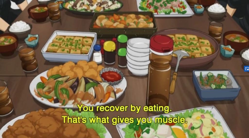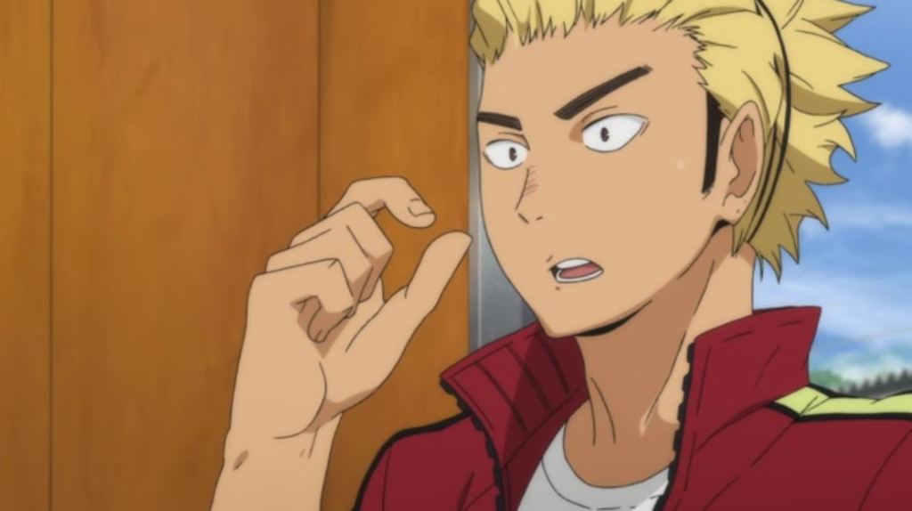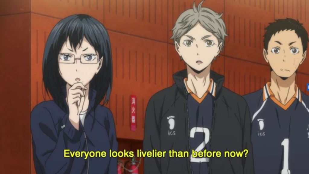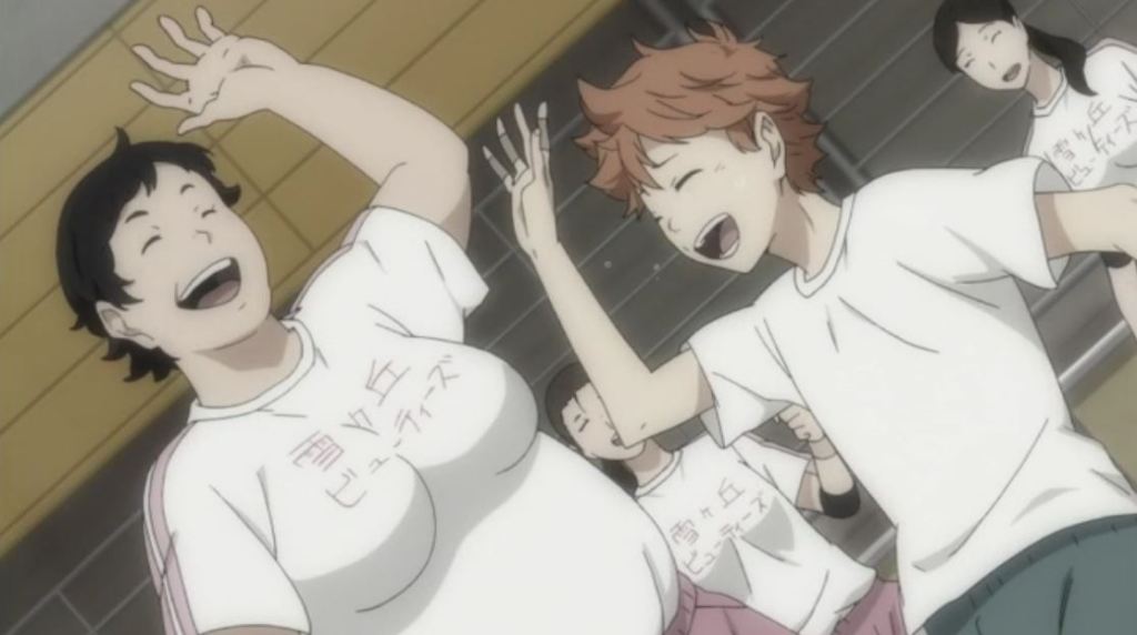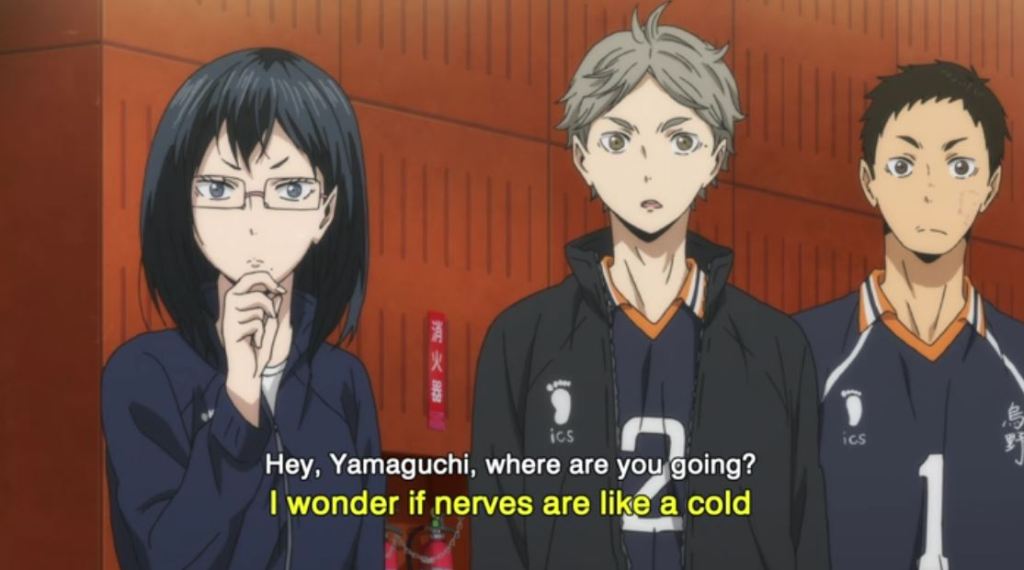 What do you do when you’re nervous or stressing out? Changing your focus and envisioning a positive outcome can help. Practice and trust in your training. Faith. Meditation. Music. Movement, like running or yoga. Rest. There are a lot of ways people handle nervous energy. Or you could view it as excitement. Sometimes our tummies can give away our nervousness. Hinata knows that very well. I’m watching Season Two of Haikyu on Hulu. In this episode, Yamaguchi is nervous about playing in the spring tournament. The thought of him repeating his blunder from the last competition makes him anxious. Yachi tries to cheer him up, but as he tells her about his ordeal, his anxiety quickly transfer to her. The group tries to make sense of it. Having experienced that on the receiving end, I totally get it. So maybe Shimizu’s guess was pretty accurate. Of course Hinata can’t resist poking at Kageyama!
