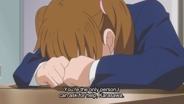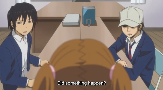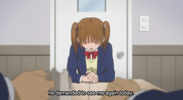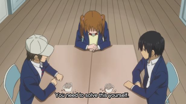 Little Sister asks for their help since the boy wants to meet with her again. I think it was good she asked for help and told someone. It is a potentially unsafe situation. Motoharu wants to go. Karasawa thinks the problem would be best solved if Little Sister addresses it herself. I understand where Karasawa is coming from. Neither boy looks happy as Little Sister leaves the room.