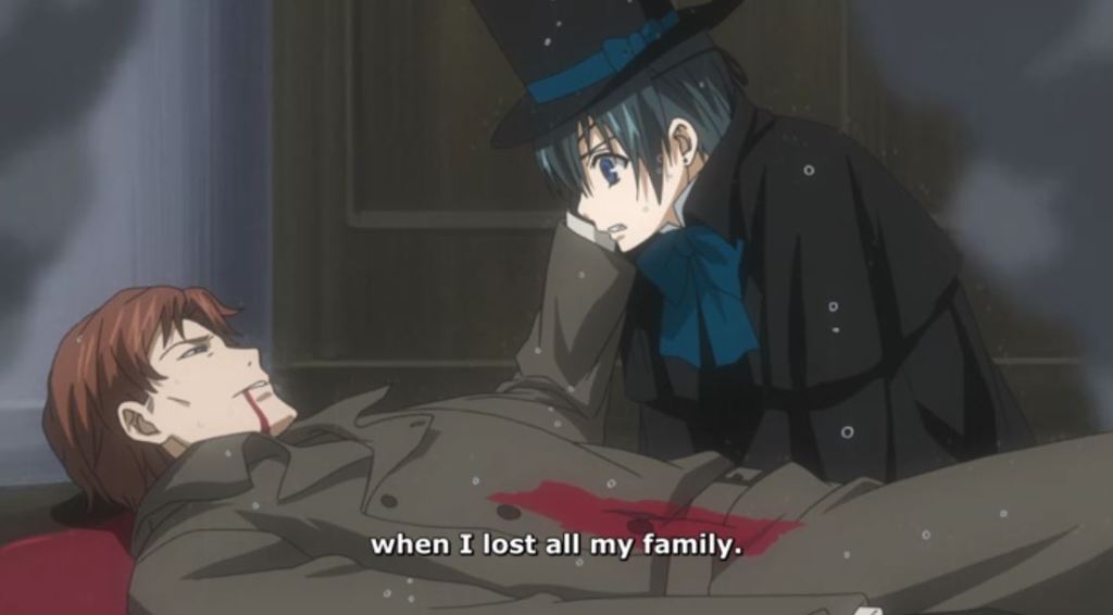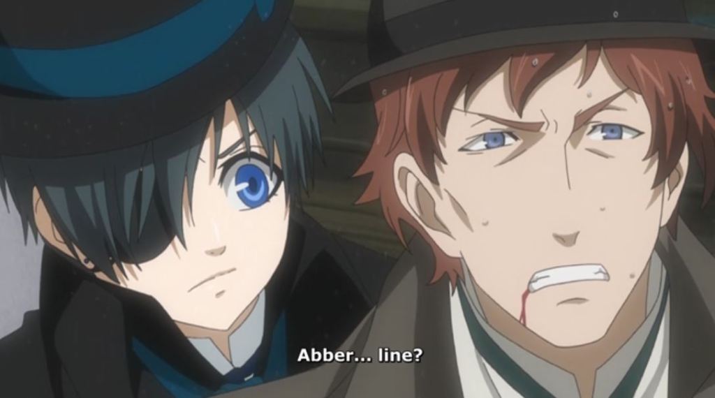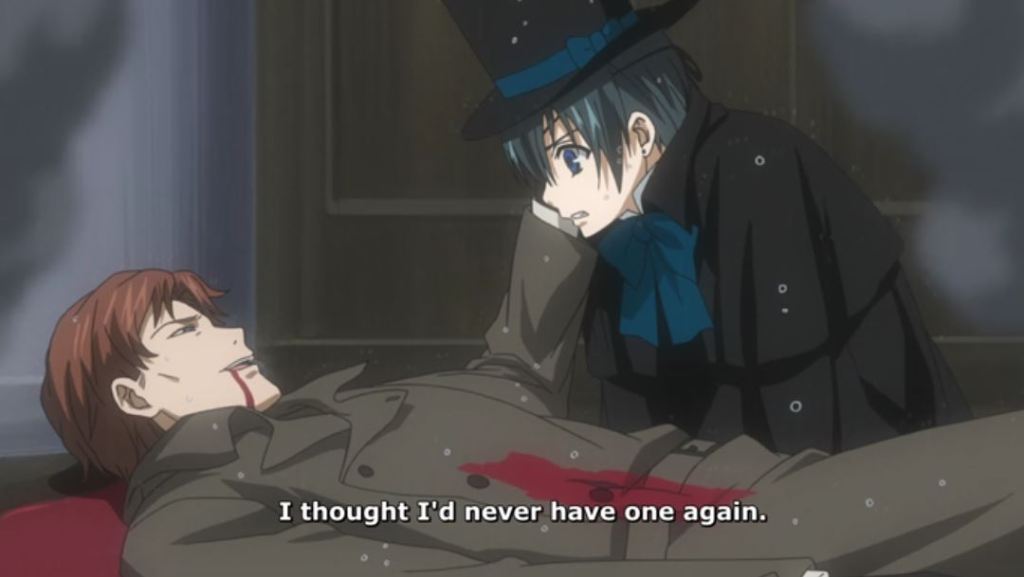 Ciel is incredibly angry with Sebastian for Abberline’s death. Sebastian points out that Ciel was unharmed. I suspect Sebatian didn’t care for Abberline. His sincerity and desire for peace, was in conflict with Ciel’s need for retribution. Sebastian probably found him a distraction to Ciel. Yet, I wonder why the anime decided to have this scene, which is different than the manga. Why create this heartbreaking scene? It changes the vibe between Ciel and Sebastian. I think it altered the way the viewers felt about Sebastian (or maybe just my feelings).