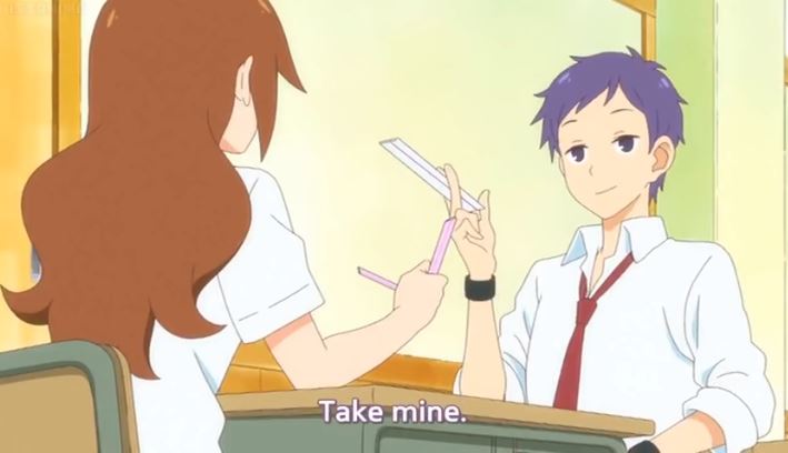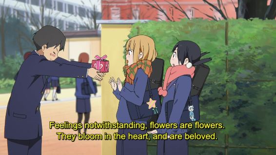 Some of the girls at school discuss buying chocolate, or making it at home. When Tamako’s friend Kanna draws up plans to design a house of chocolate, her friends support her endeavor. Plus we get to see her finished results at the end of the episode! I want to know who was the recipient of that giant chocolate house?! Did she share with the entire class?!