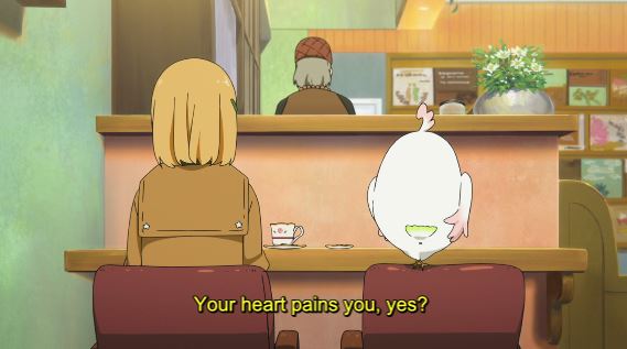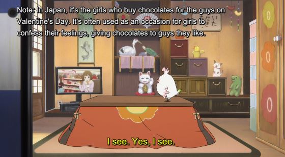 As Tamako discusses her idea for their mochi shop, Dera is perplexed hearing about “Valentine’s Day.” It is an unknown concept to him. But he learns from television how they celebrate in Japan.