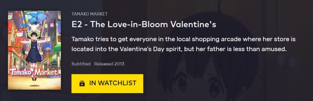 Happy Valentine’s Day! If you’re looking for something to watch today, I’d suggest Tamako Market’s second episode, “The Love-in-Bloom Valentine’s.” Below is a blurb from VRV/HiDive.